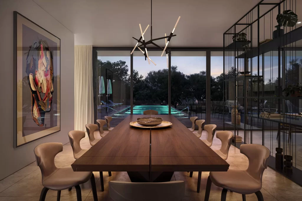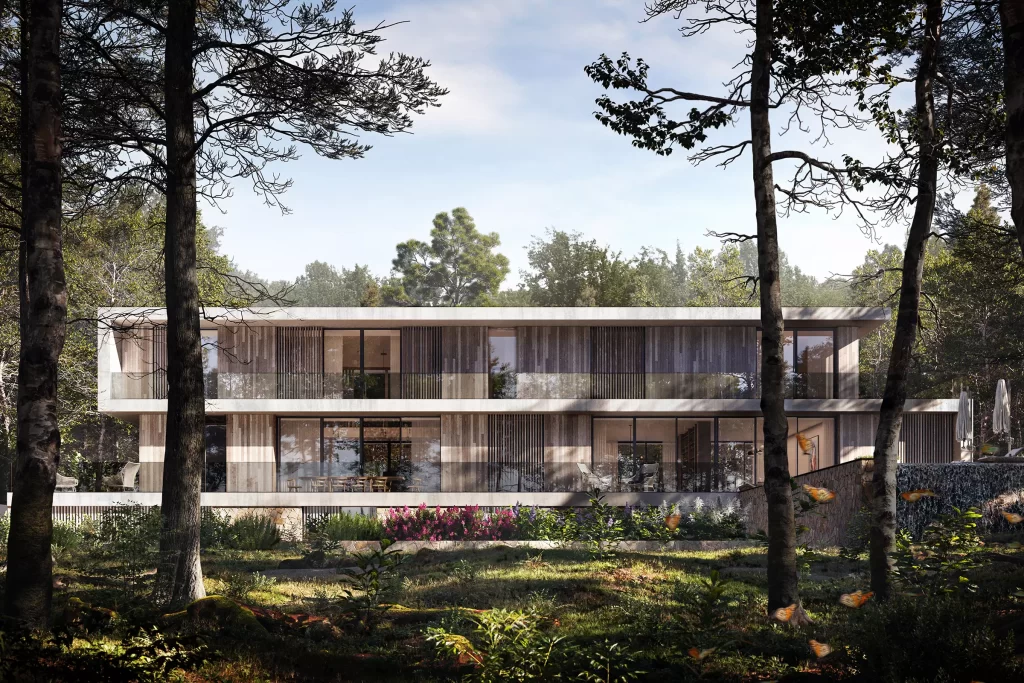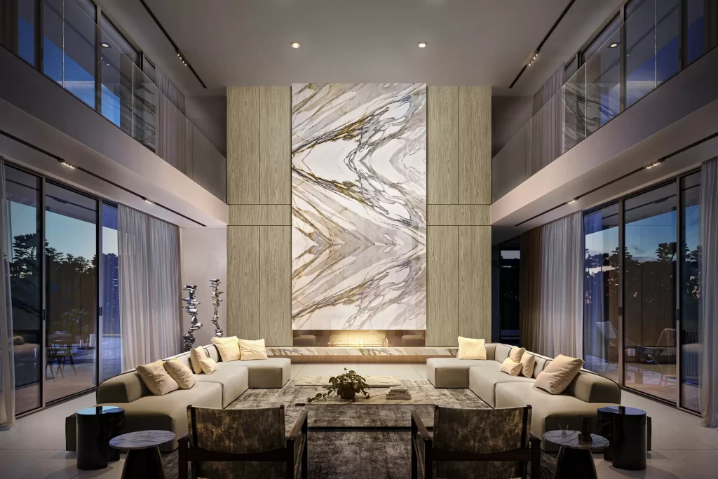 This holiday retreat comprises 3-story villa of 12,000 SF, front terrace and infinity edge swimming pool with overlook in the forest, sunken landscaping, and approximately 1-acre of land. Column free interior spaces run the full width of the house with majestic floor to ceiling sliding doors on both sides, through which views, light and air completely penetrate the structure, dissolving its mass. The interiors feature premium quality Italian finishes such as Calacata Gold marble and fossil oak for the kitchen on the main floor, European oak wood floor and custom made bathroom vanities topped with Carrara Extra marble on the upper floor.
