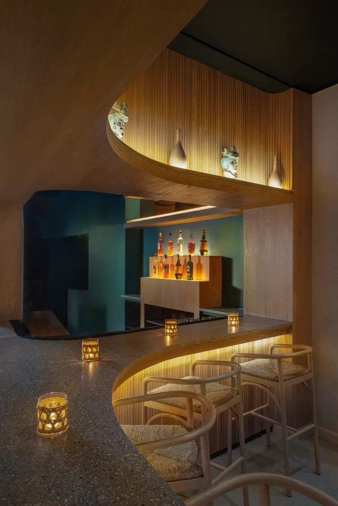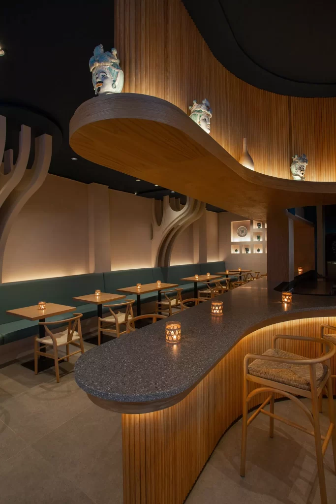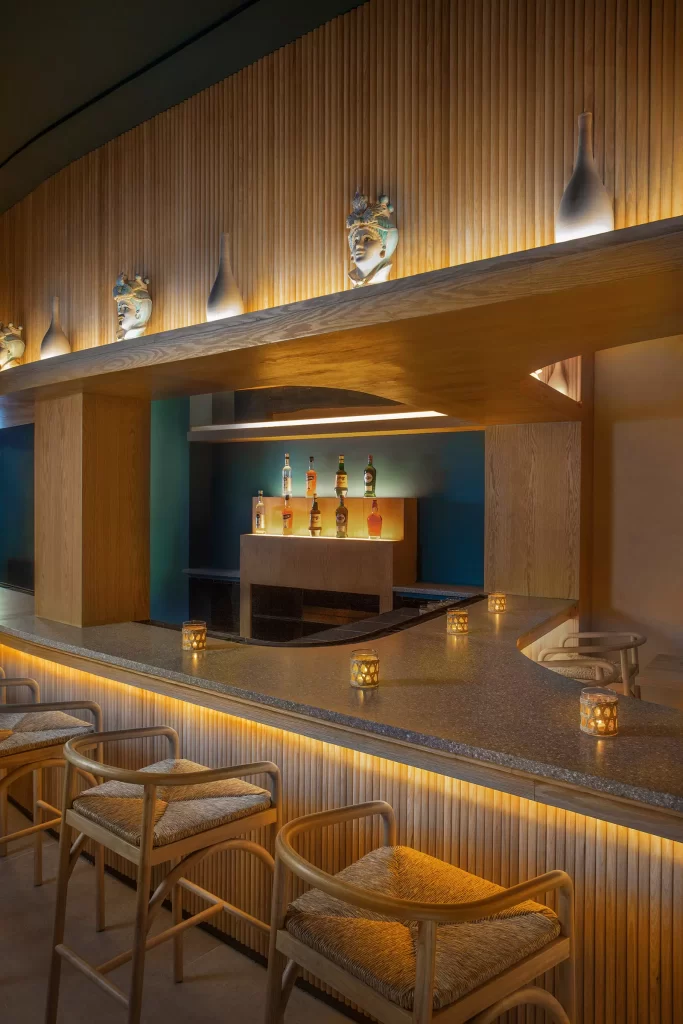 The combination of teal colors and light Marmorino plaster creates an harmonious dialogue with the natural oak used in the bar counter and for the furniture. The inviting design of the bar is inspired to pelagic structures and combines sophisticated finishes such as fluted surfaces in natural white oak and Italian terrazzo made with Bardiglio Nuvolato marble. Wall niches on the back wall and Majolica pottery crafted in Italy complete the coastal look, for a full immersive Mediterranean experience.