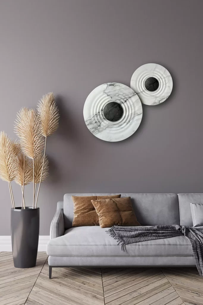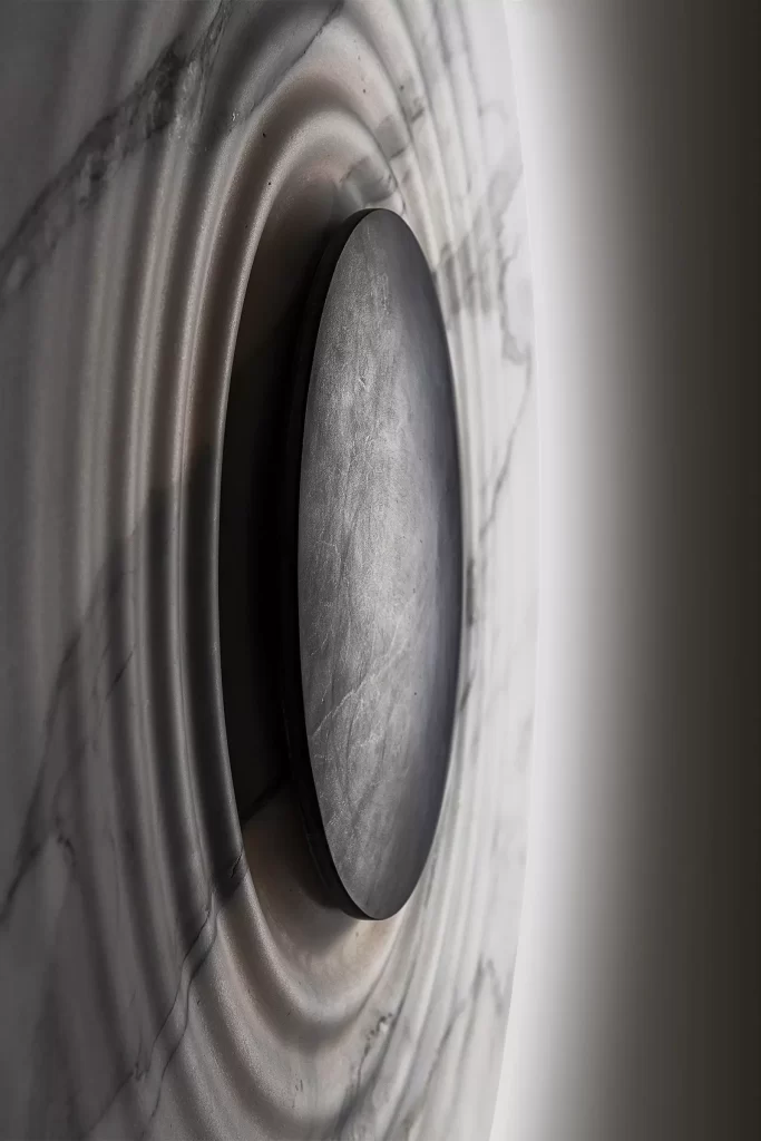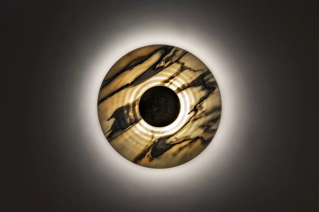 Named after the French astronomer Charles Messier and masterfully crafted in Italy with Calacata marble, Messier evokes the strangest and most fascinating objects in our universe. Creators and destroyers of our cosmos, black holes reverse everything we know about the sky above us. Messier is both a lighting fixture and a sculpture. When the lamp is lit up, the light is softly released through the white surface, while the veins of the stone become dark, evoking chaos and mystery beyond the event horizon. When the lamp is off, Messier becomes a sculpture and displays the vivid colors and complexity of an extraordinary stone. Messier is 100% crafted in Italy by ETAMORPH.